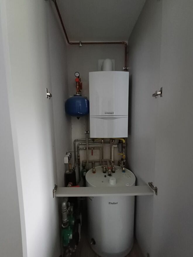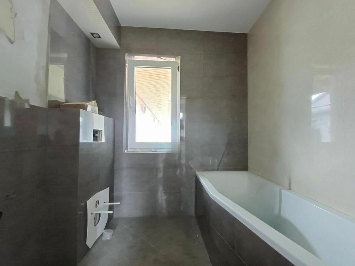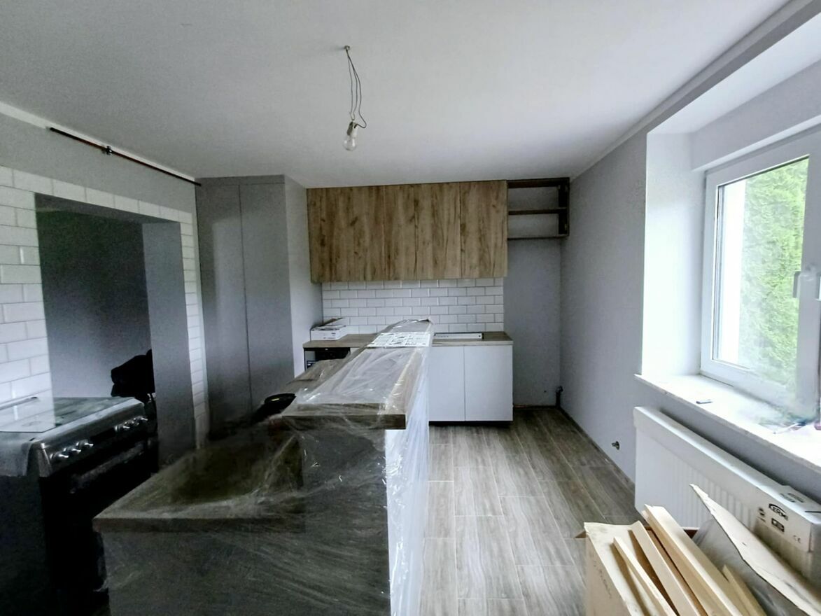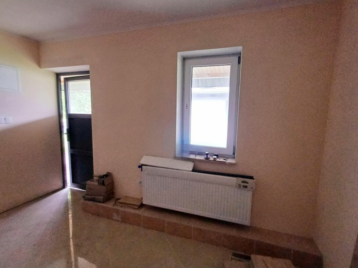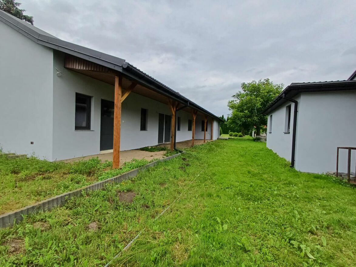 Mniejszy budynek gotowy do zamieszkania lub na wynajmy. Powierzchnia gotowego budynku 120 m2. Składa się on z mieszkania 50m2 ( pokój, kuchnia, łazienka, przedpokój) + 2 samodzielne pokoje z łazienkami ( kabiny prysznicowe) + pokój bez łazienki. Ogrzewanie gazowe, podłogowe i dodatkowo co.